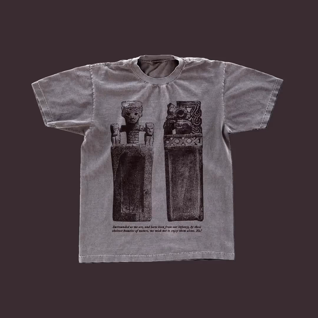 The blank is washed grey/brown, pigment-dyed & heavyweight 7.6 oz 100% cotton. The fit is slightly cropped with a boxy, relaxed fit and it'll get get softer with each wear.