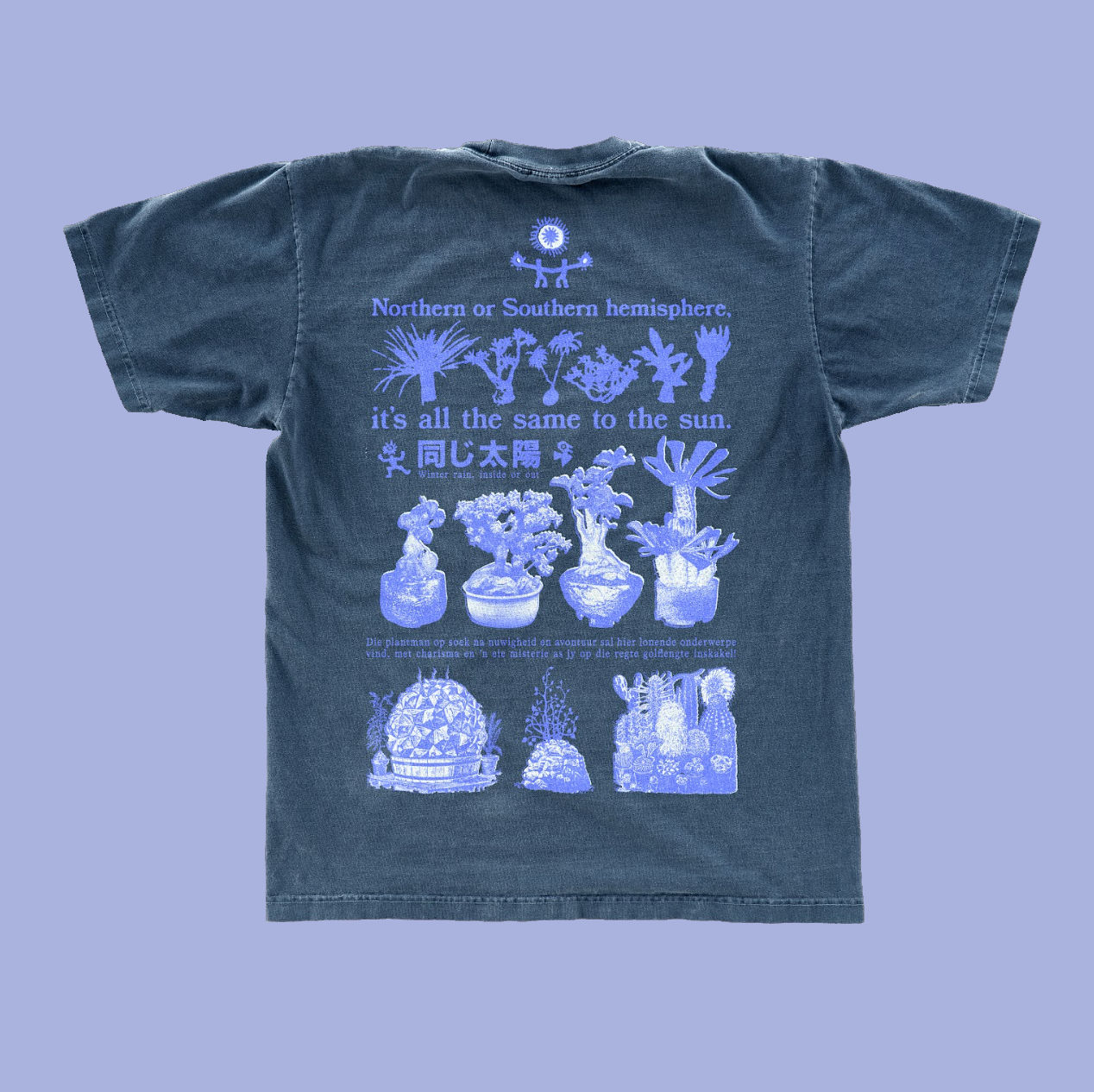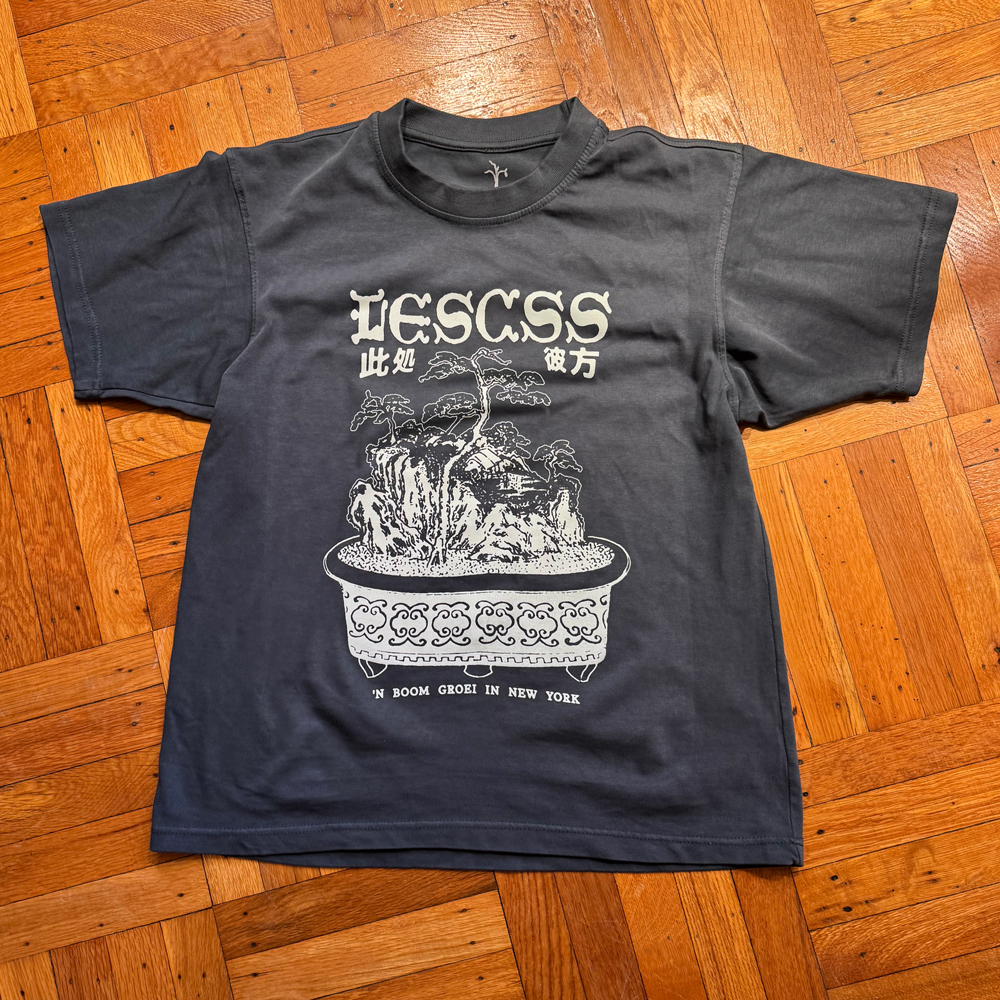 The blank is midnight navy, pigment-dyed & heavyweight 7.6 oz 100% cotton. The fit is slightly cropped with a boxy, relaxed fit and it'll get get softer with each wear.